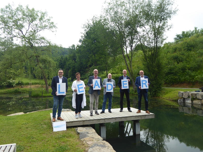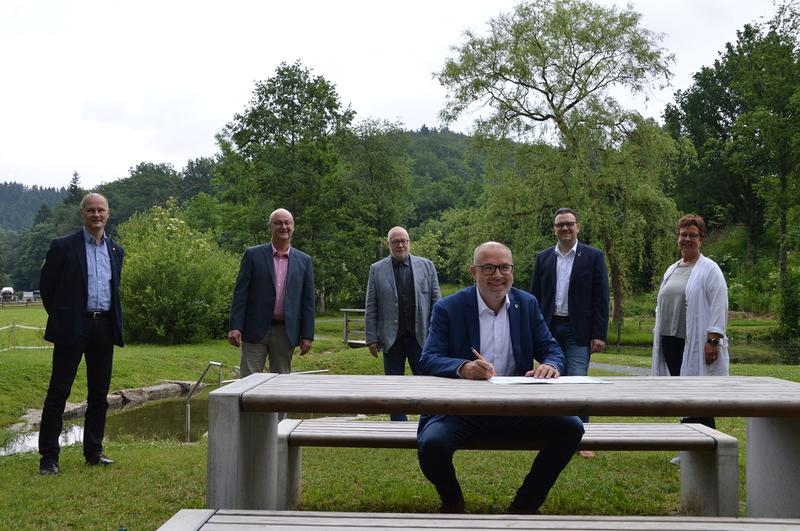 Am Donnerstag, 24. Juni, trafen sich die Vertreterinnen und Vertreter aller sechs LenneSchiene Kommunen an Ruhrmanns Teich in Finnentrop, um die Absichtserklärung für eine erneute Bewerbung der LenneSchiene für das EU-Förderprogramm LEADER zu unterzeichnen.